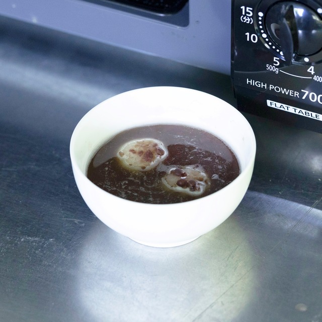 「ぜんざい玉」2個と水100mlを入れ、電子レンジ(500W)で約1分30秒。