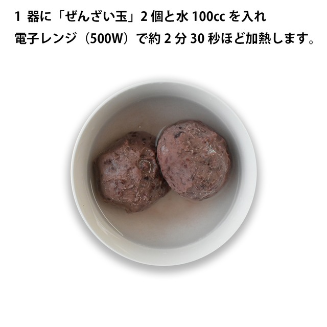 「ぜんざい玉」2個と水100mlを入れ、電子レンジ(500W)で約2分30秒。